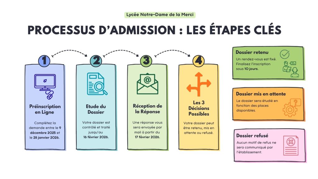 Vous avez choisi, au nom de votre enfant, de déposer un dossier d’inscription en classe de Seconde générale et technologique au lycée privé Notre-Dame de la Merci pour la rentrée prochaine et nous vous remercions de l’attention que vous portez à notre établissement.