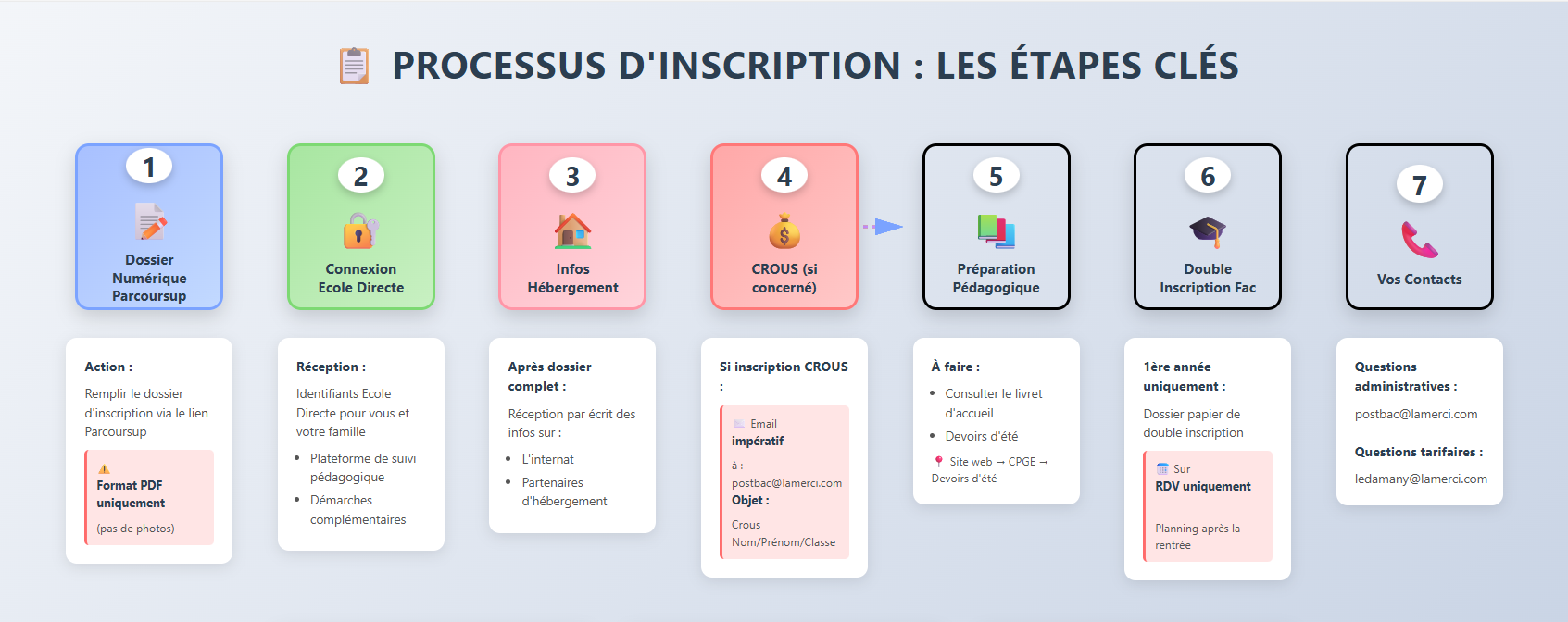 - Cas particulier : inscription au Crous en direct. Dès la réalisation de l’inscription, la famille informe la Prépa afin de percevoir les règlements du Crous au plus tôt à postbac@lamerci.com en précisant dans l’objet du mail : Nom/ Prénom/Classe de Prépa.